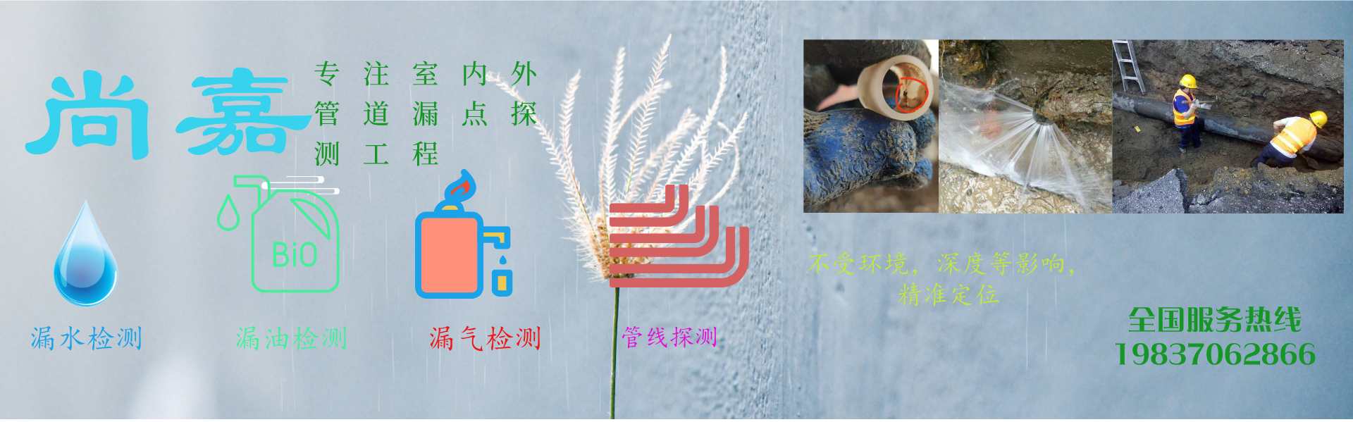 尚嘉管道检测服务有限公司,是一家专业查找室内外管道漏水的公司,进口设备,15年查漏经验,专业团队,快速精准定位漏水点,让损失降到最低,专业承接:水管漏水,暖气漏水,消防管道漏水,水务公司管线普查,管线探测,堵点精准定位,暖气,线管等均可精准定位,家庭漏水,学校,工厂,宾馆,水务公司,暖气公司,消防安装公司等均可,专业,专注,用心服务,欢迎来电咨询 19837062866
